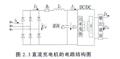 直流充電樁電氣系統(tǒng)三相電網(wǎng)輸入交流電,經(jīng)過(guò)三相橋式不可控整流電路整流變成直流電,濾波后提供給高頻DC-DC功率變換器,功率變換器經(jīng)過(guò)直直變換輸出需要的直流,再次濾波后為純電動(dòng)汽車(chē)動(dòng)力蓄電池充電。