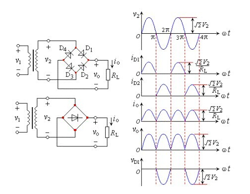 全波整流電路:利用副邊有中心抽頭的變壓器和兩個二極管構成如下圖所示的全波整流電路,從圖中可見,正負半周都有電流流過負載,提高了整流效率。